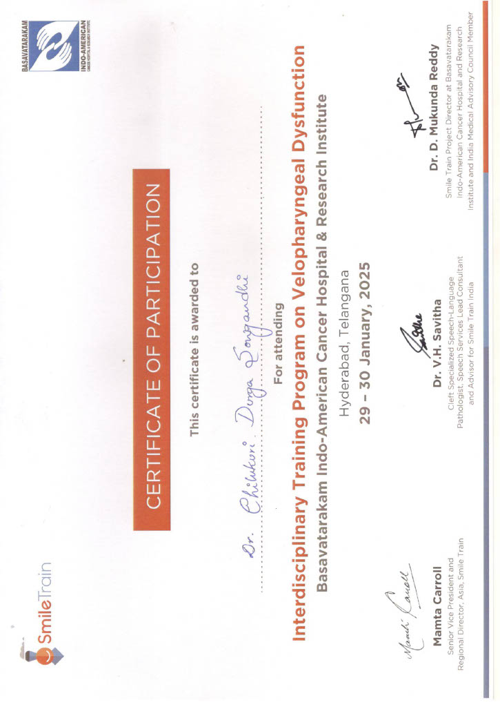 - Interdisciplinary Training Program On Velopharyngeal Dysfunction (Smile Train) at Basavatarakam Indo-American cancer, Hospital & Research Institute, Hyderabad, India