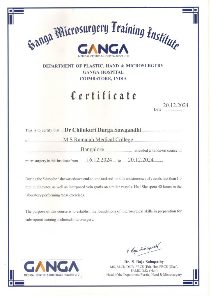 - M.Ch – Plastic Surgery from M.S. Ramaiah Medical College, Bangalore.