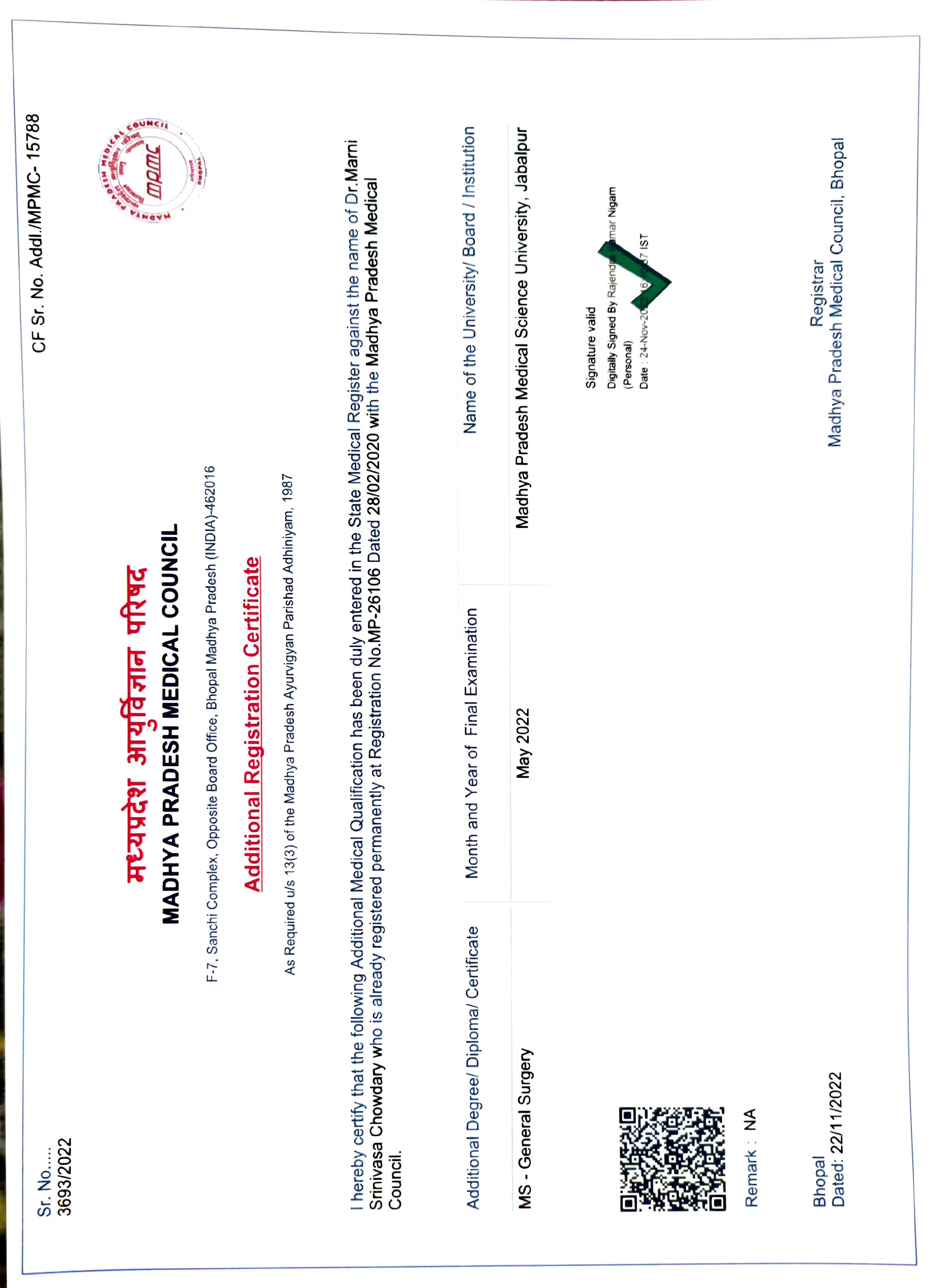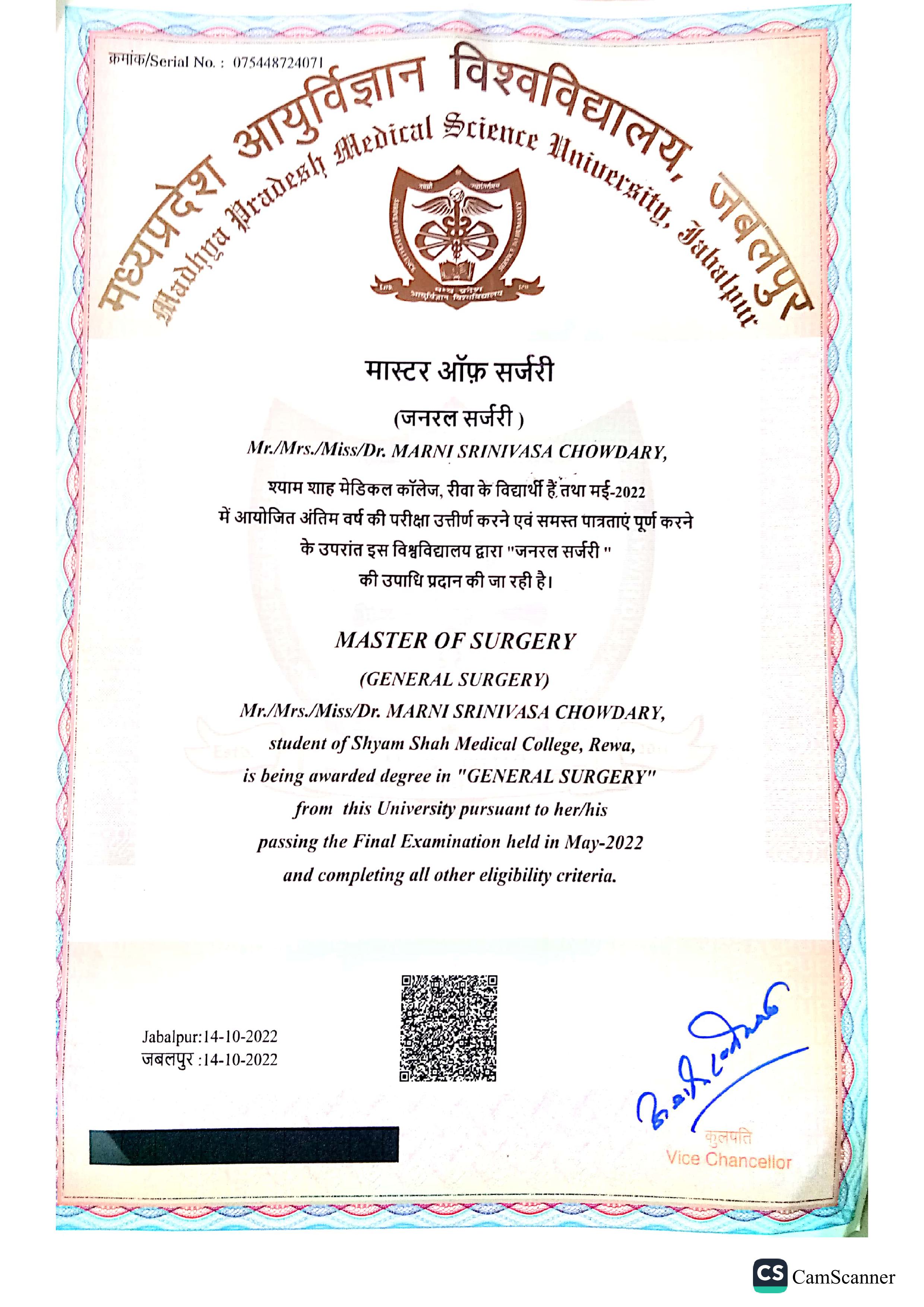 - MS – General Surgery Shyam Shah Government Medical College - Rewa, Madhya Pradesh, India.